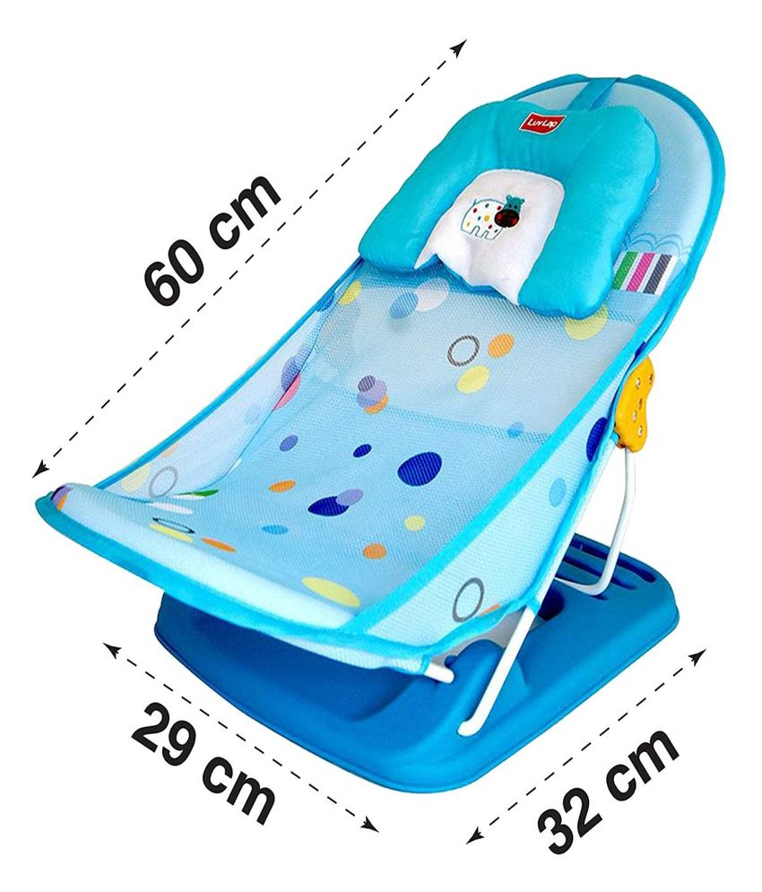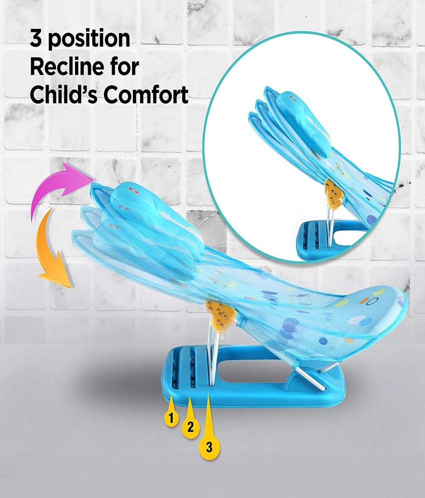 Luvlap baby bather is suitable for newborn and small babies needing support to sit. The adjustable backrest helps recline the baby in 3 different positions. Padded head support and cushioned sides make it comfortable. Its easy to fold and carry and can also be machine washed.