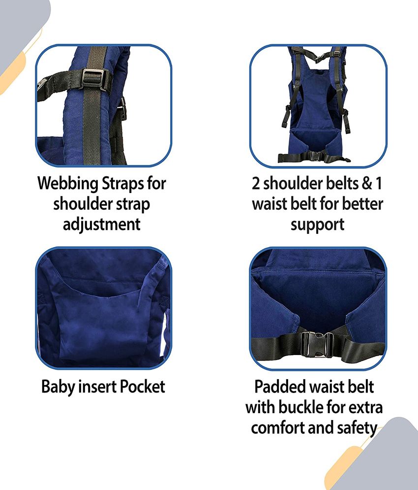 Made of 100 percent Cotton, 2 Carry Positions ? Inward facing and Piggy back style, 3 belts ? 2 shoulder belts and one waist belt for superior lumbar support, Detachable Sleeping Hood ? Allows baby to relax and sleep peacefully, Padded Shoulder strap for the parent?s comfort, Shoulder Strap Buckle for enhanced security, Chest Strap with Buckle to ensure safety.