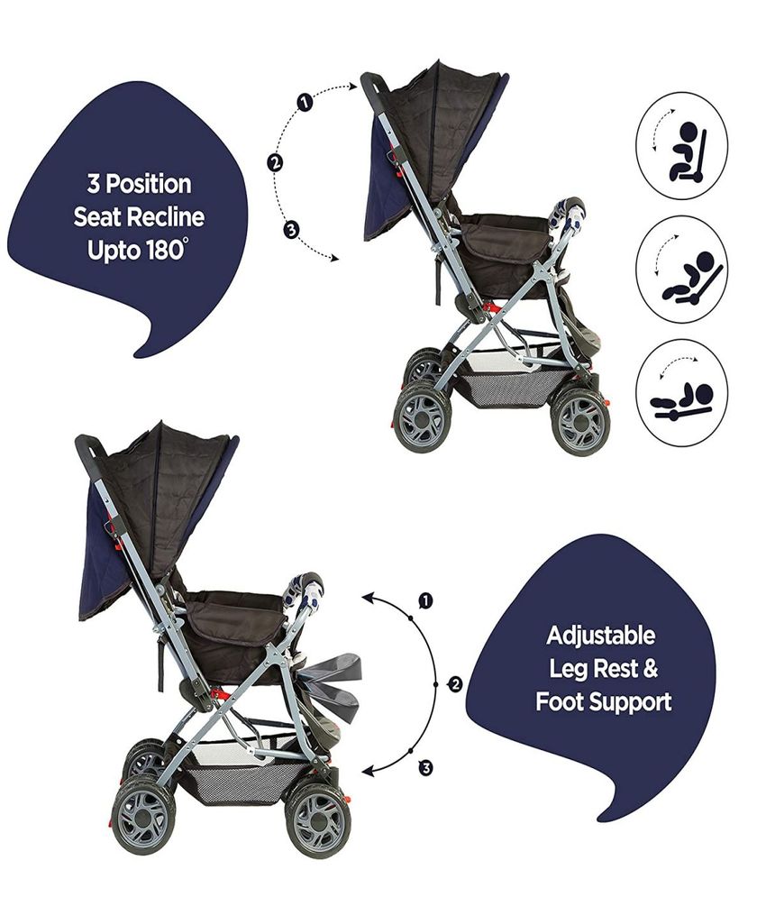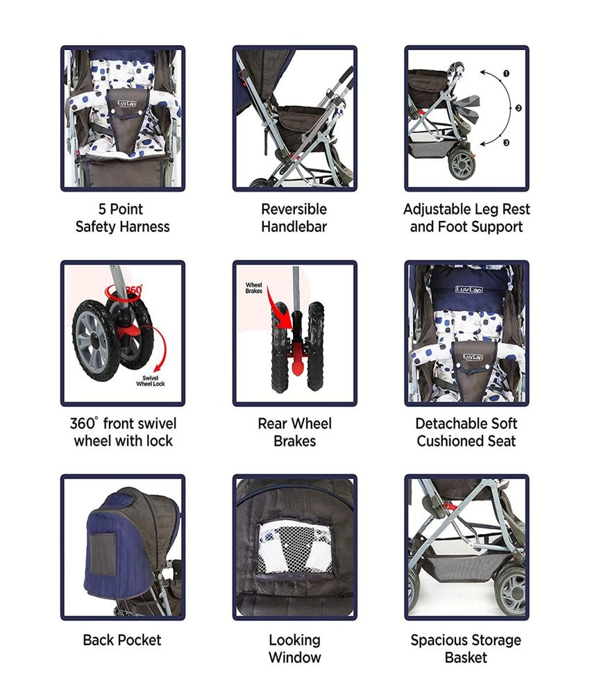 This LuvLap Baby Stroller is here to take care of your little one. Sunshine stroller makes sure that your child is comfortable and secure while roaming around and enjoys the sights. It has unique features that makes it more reliable such as a 5 point safety Harness helps keep baby safe and comfortable in sitting or sleeping positions, 3-position Seat Recline, Reversible Handle Bar, Front swivel Wheels with Lock, Rear Wheels Brake, Detachable & Washable Cushined Seat, Safety belt, Adjustable Canopy, Adjustable Leg Rest with Foot Support, Back Pocket, Storage basket & Looking window to keep a watch on your baby while Strolling.Recommended for children between age 0 to 36 months weighing upto 15 kgs.