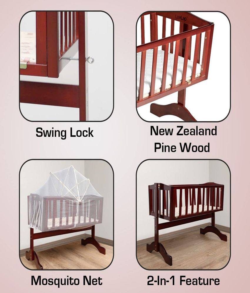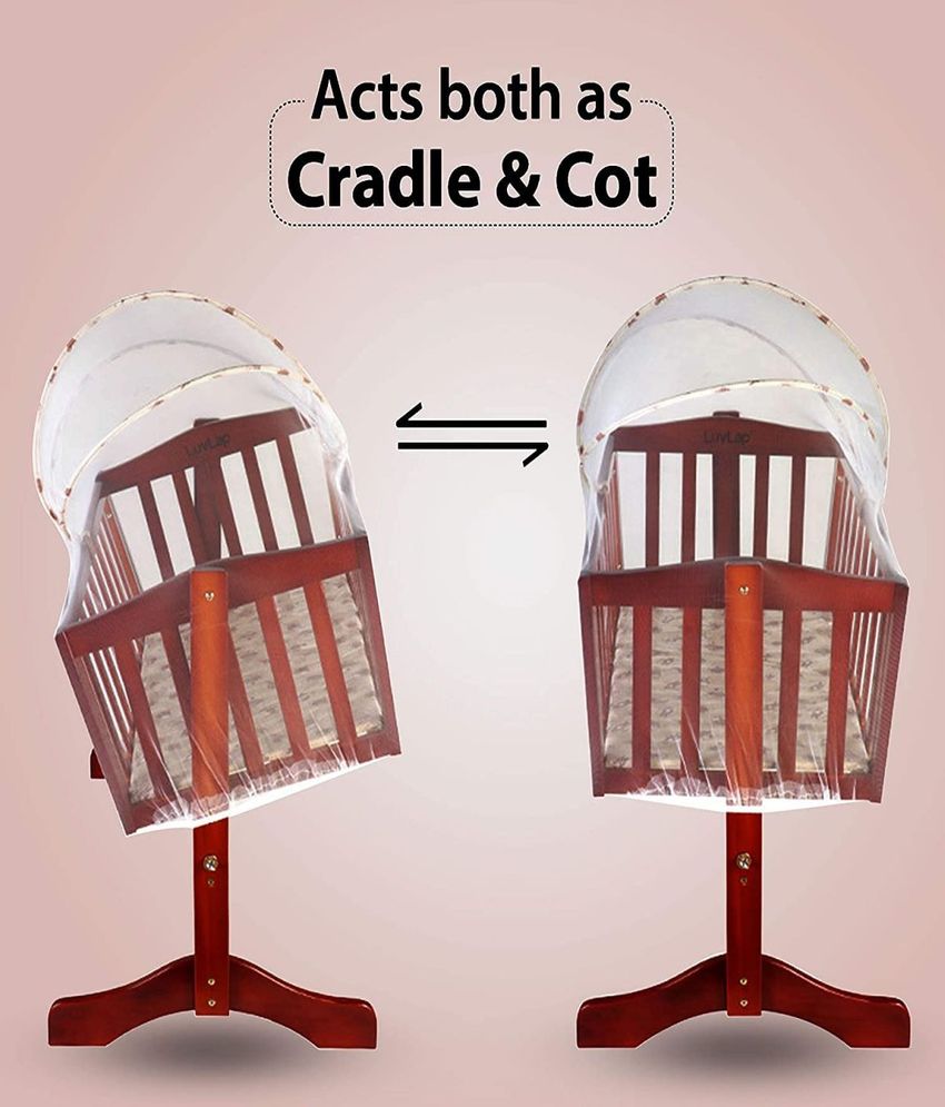 LuvLap Baby wooden cot with cradle is designed for little babies to protect them from fall down. Baby Cot with Cradle helps you to make your baby naptime as restful as possible. It is Certified as per European Standards, and that the Cot can be easily converted into cradle. It comes with Mosqito net, Recommended age - 0 - 12 Months & weght up to 15 Kgs