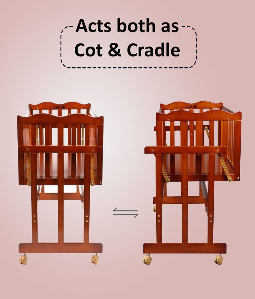 LuvLap C - 50 Baby cot with cradle safety protector is designed for little babies to protect them from falling down. It is Certified as per European Standards to guarantee the safety of your baby. The Cot can easily be converted into cradle. It comes with Mosqito net, Reversible Wheels with brakes & extendable front bar. The fabric-wrapped cot base is robust with good air flow. Recommended age - 0 - 12 Months & weght up to 15 Kgs