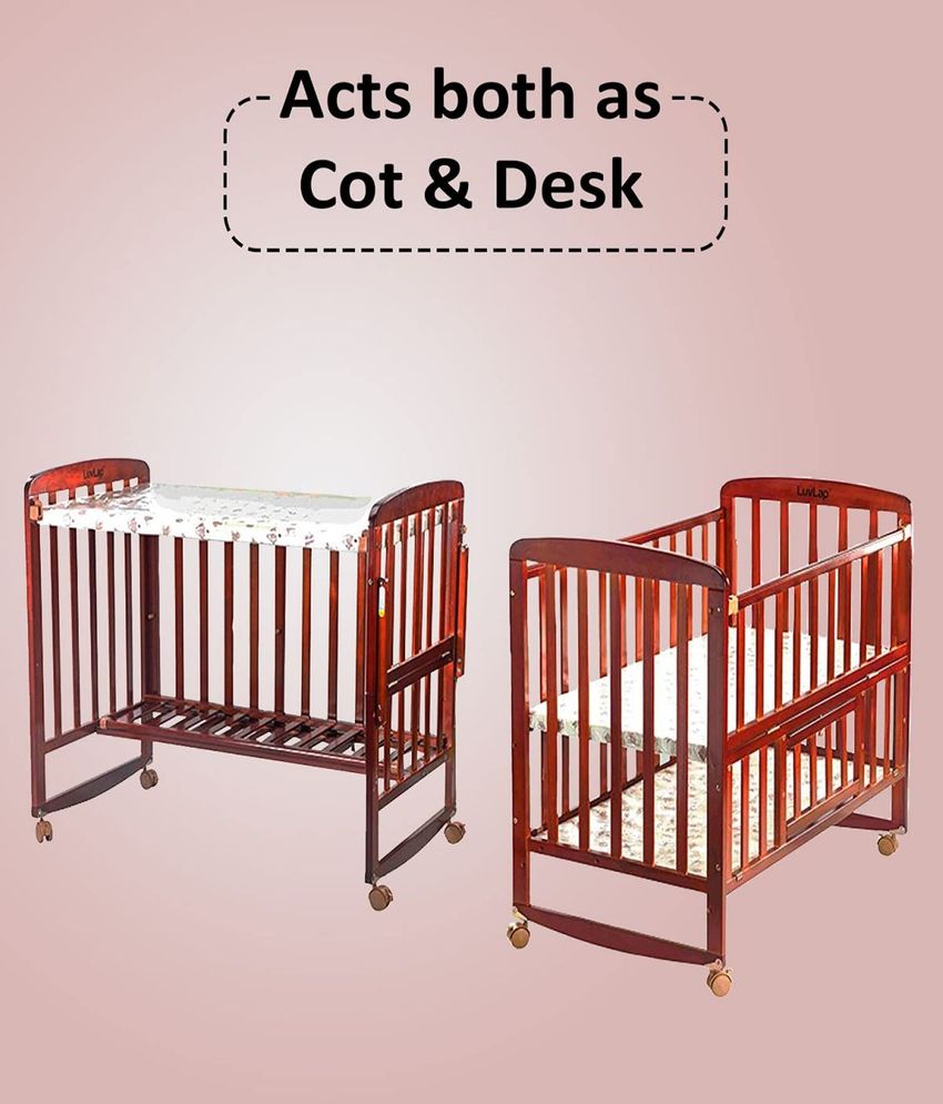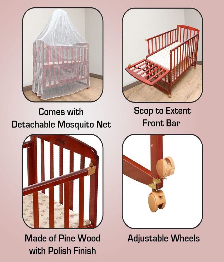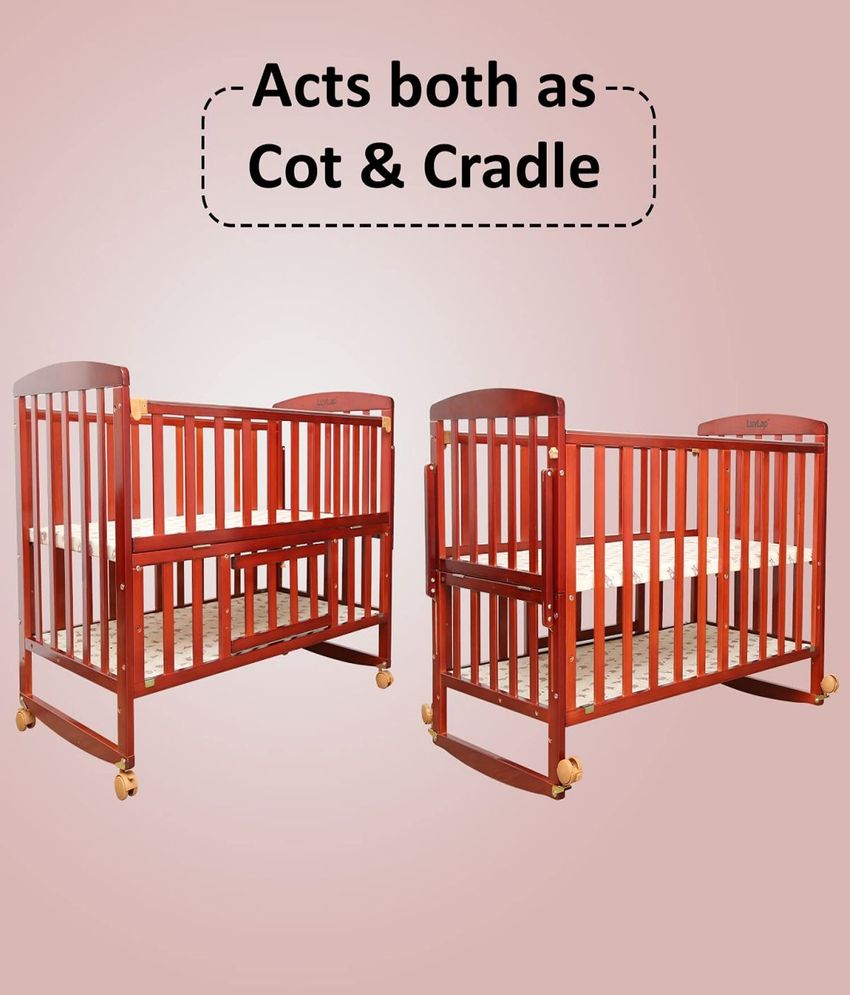 LuvLap C - 50 Baby cot with cradle safety protector is designed for little babies to protect them from falling down. It is Certified as per European Standards to guarantee the safety of your baby. The Cot can easily be converted into cradle. It comes with Mosqito net, Reversible Wheels with brakes & extendable front bar. The fabric-wrapped cot base is robust with good air flow. Recommended age - 0 - 12 Months & weght up to 15 Kgs