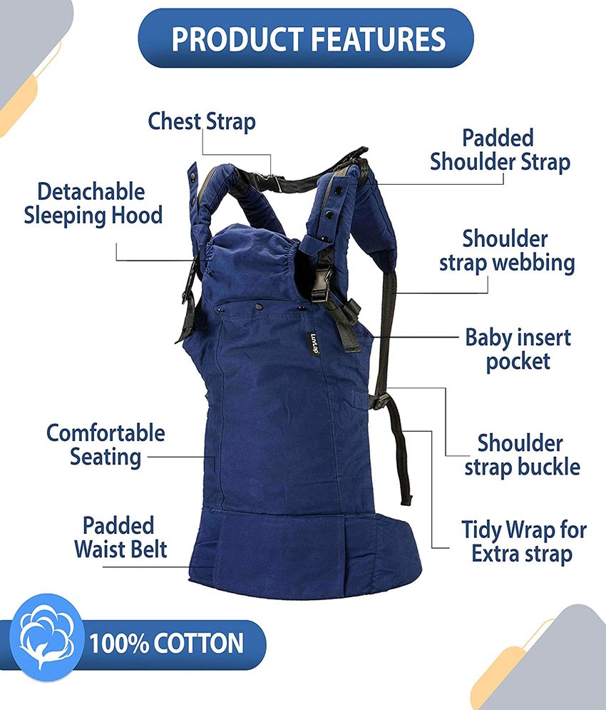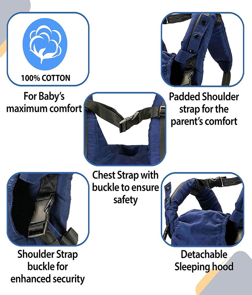 Made of 100 percent Cotton, 2 Carry Positions ? Inward facing and Piggy back style, 3 belts ? 2 shoulder belts and one waist belt for superior lumbar support, Detachable Sleeping Hood ? Allows baby to relax and sleep peacefully, Padded Shoulder strap for the parent?s comfort, Shoulder Strap Buckle for enhanced security, Chest Strap with Buckle to ensure safety.