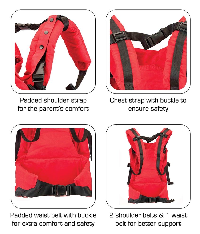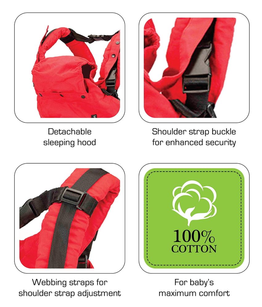 Made of 100 percent Cotton | 2 Carry Positions ? Inward facing and Piggy back style | 3 belts ? 2 shoulder belts and one waist belt for superior lumbar support | Detachable Sleeping Hood ? Allows baby to relax and sleep peacefully | Padded Shoulder strap for the parent?s comfort | Shoulder Strap Buckle for enhanced security | Chest Strap with Buckle to ensure safety | Webbing straps for shoulder strap adjustment, padded waist belt with buckle for extra comfort and safe