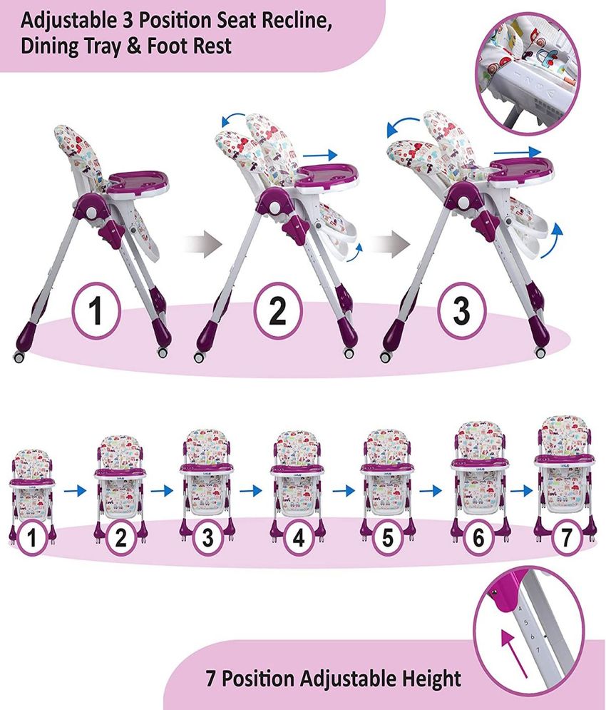 Feed your baby with utmost comfort and ease with LuvLap Royal High Chair. The 5 point safety harness keeps your baby secure and the 7 level height adjustment makes it comfortable to seat him/her. It is equipped with wheels for easy movement across rooms.
