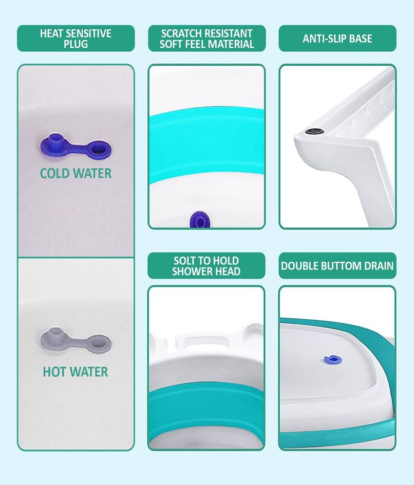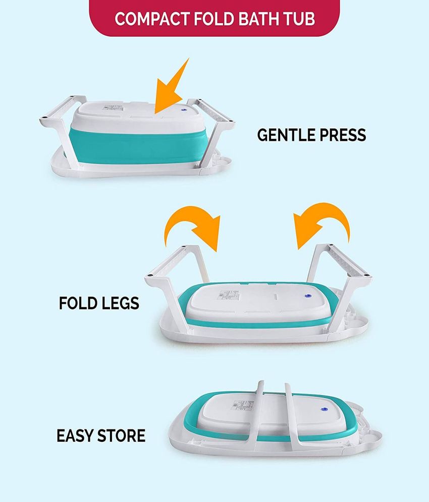 Luvlap baby splash & fold up bathtub is suitable for newborn babies. It is Certified as per European Standards: EN 71. Its temperature Sensitive Water Plug changes color from Blue to White if water becomes hot. It is made of BPA-free eco-friendly, Food-Grade & non-toxic material. Ergonomic and spacious design helps baby sit comfortably and securely while bathing
